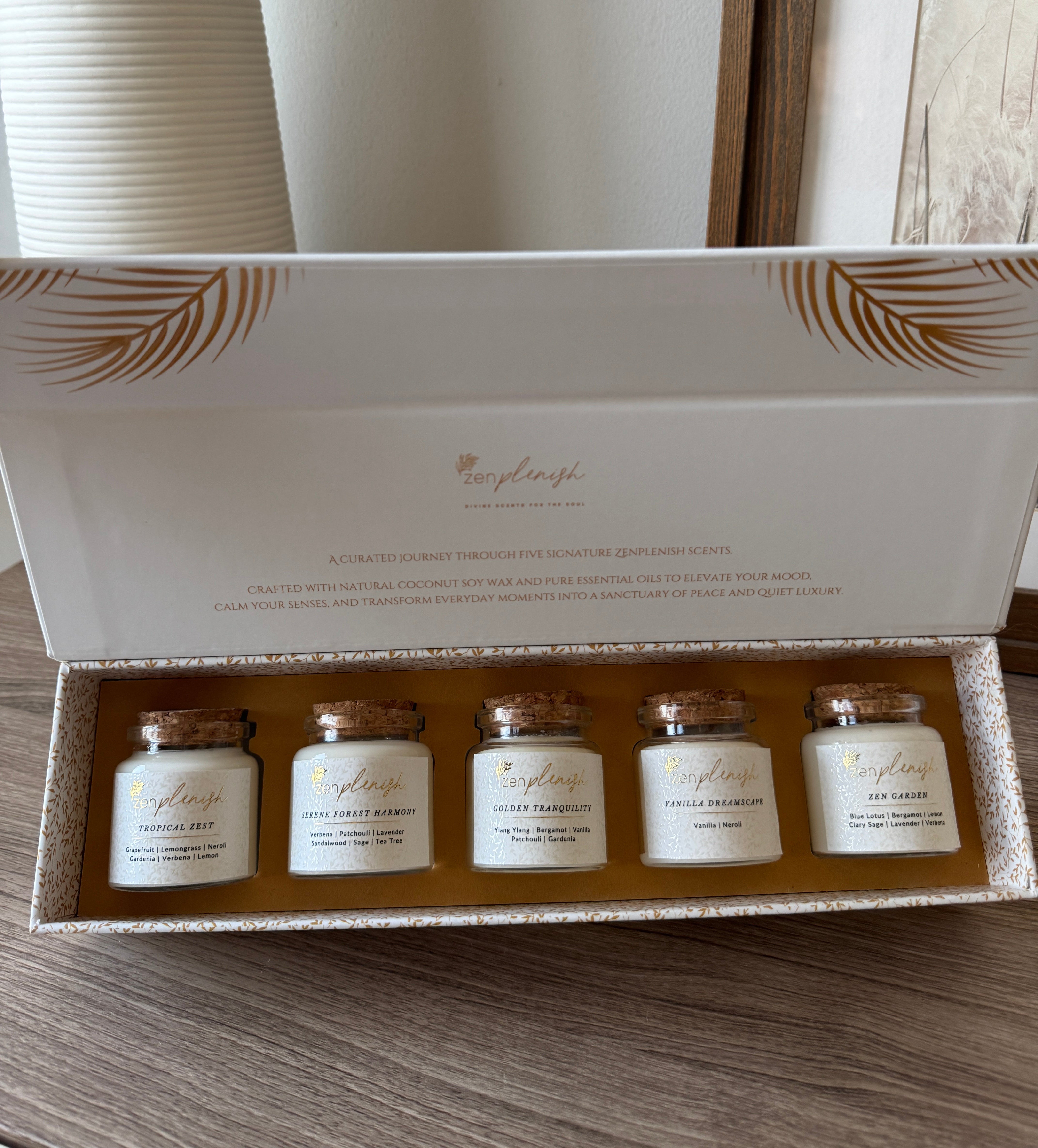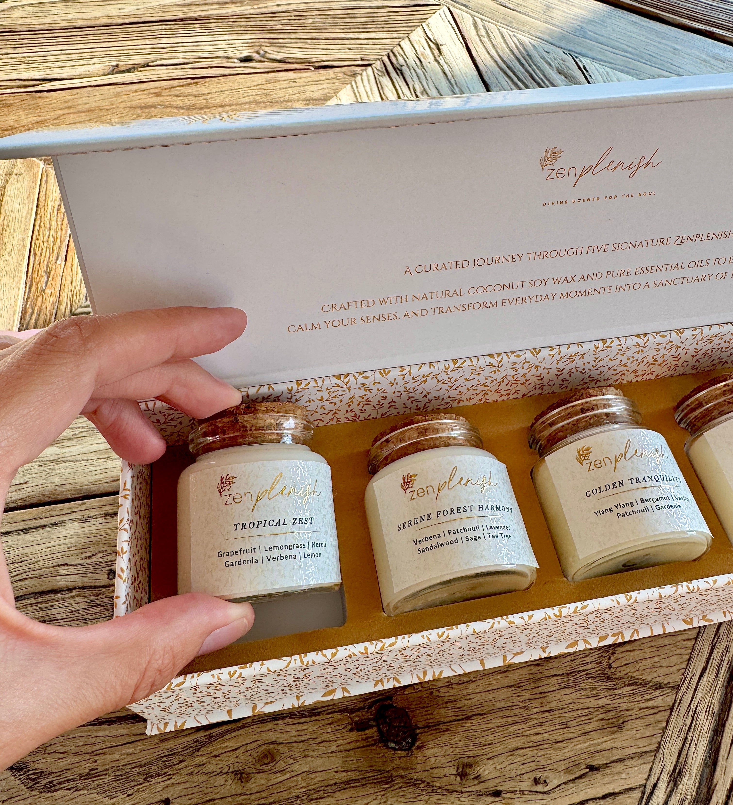 Discover all five Zenplenish candle scents in an elegant set, designed to elevate your space and soothe your senses. Each candle is expertly blended and hand-poured in the UAE with natural coconut-soy wax, pure-grade essential oils, and crafted in small batches for a clean, comforting burn.