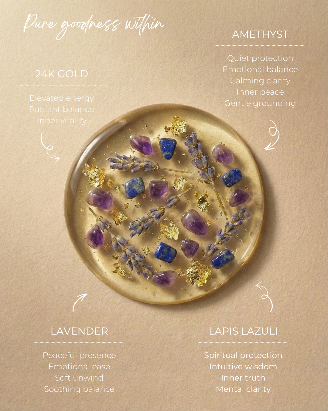 Infused with 24K Gold for refinement, Amethyst and Lapis Lazuli to support intuition and inner calm, and dried Lavender buds to promote inner harmony.